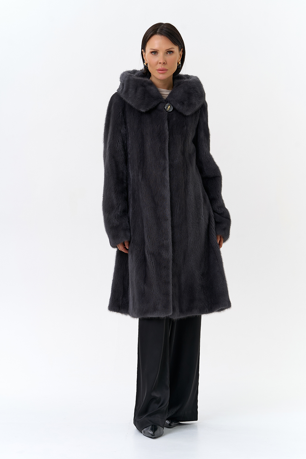 Норковая шуба годе/балетка в роспуск с капюшоном в роскошном цвете графит - это то изделие, в котором и девушка, и более взрослая леди почувствует себя особенно привлекательной. Этот фасон универсален, потому что позволяет экспериментировать с образами благодаря обуви и аксессуарам. Изделие дополнено пуговицами и шубными крючками. Представлен большой размерный ряд от 40 до 52 размера.